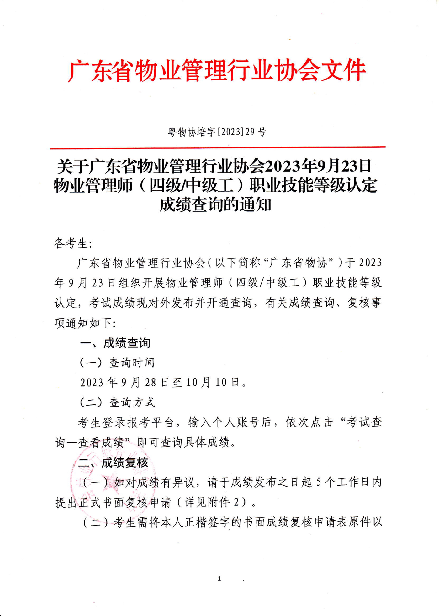 通知及附件下载:关于广东省物业管理行业协会2023年9月23日物业管理师(四级中级工)职业技能等级认定成绩查询的通知
