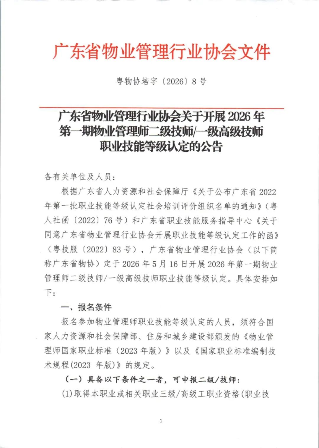 通知附件下载:广东省物业管理行业协会关于开展2026年第一期物业管理师二级技师一级高级技师职业技能等级认定的公告附件