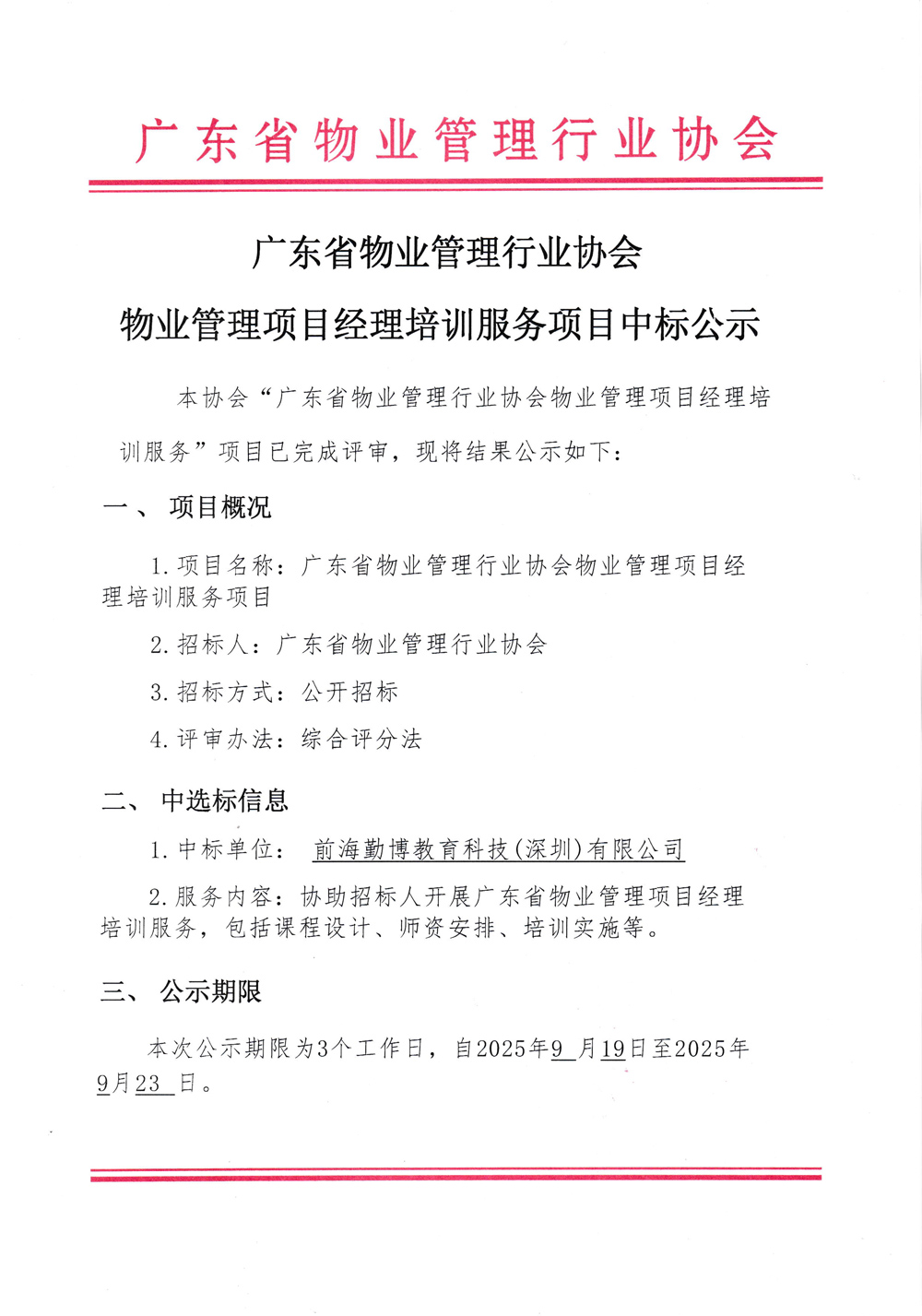 厂东省物业管理行业协会物业管理项目经理培训服务项目中标公示