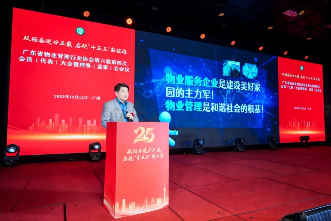 春潮涌动启新程,奋楫笃行向未来。12月12日下午,广东省物业管理行业协会第六届第五次理(监)事会会议暨第四次会员(代表)大会在广州阳光酒店隆重举行。来自全省物业行业的418名会员代表齐聚一堂,共同总结协会2025年工作成效,科学谋划2026年发展方向,审议关键工作议案,凝聚行业发展合力,携手开启广东物业行业“十五五”高质量发展新篇章,会议全程高效有序、成果丰硕。